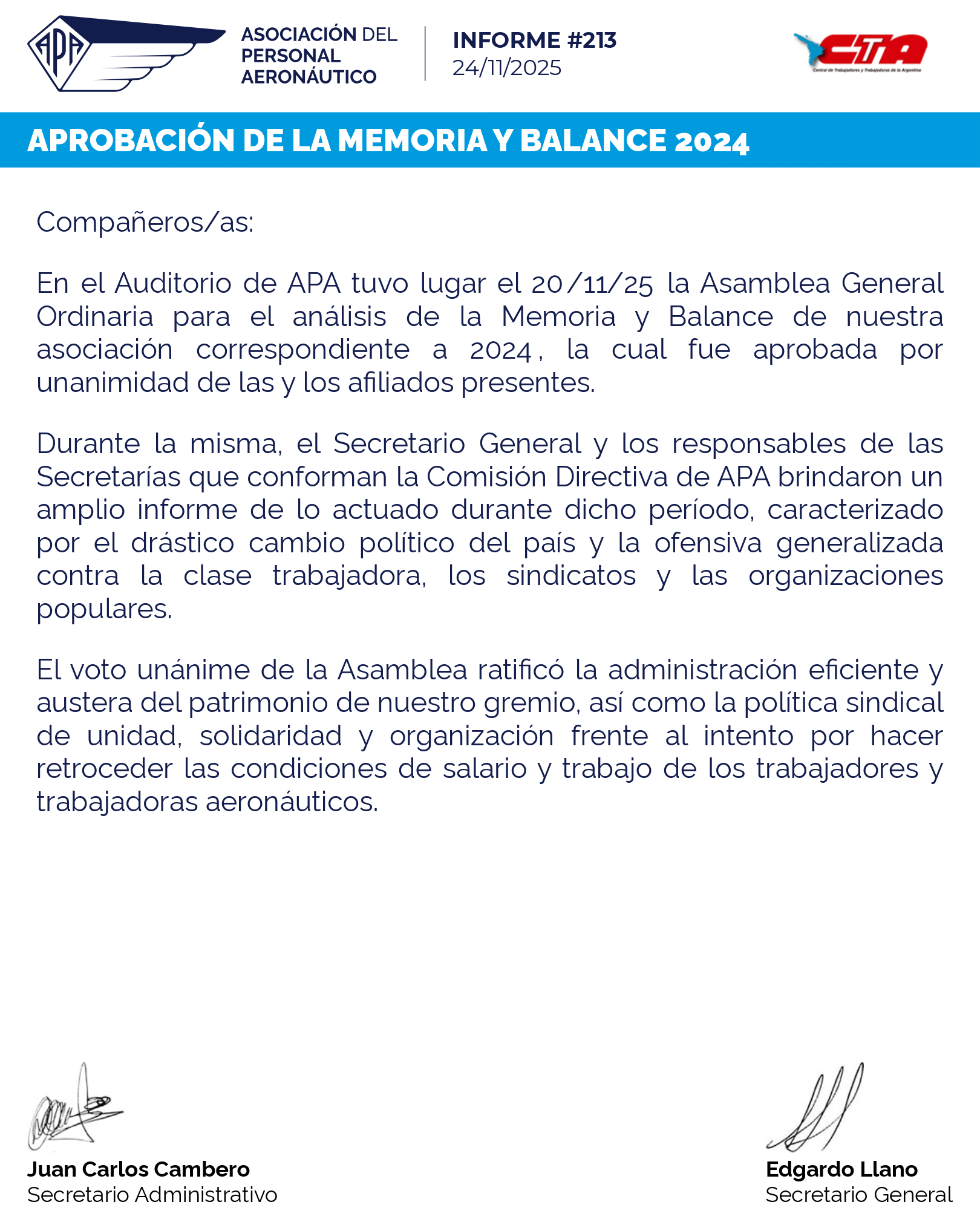 El voto unánime de la Asamblea ratificó la administración eficiente y austera del patrimonio de nuestro gremio, así como la política sindical de unidad, solidaridad y organización frente al intento por hacer retroceder las condiciones de salario y trabajo de los trabajadores y trabajadoras aeronáuticos.