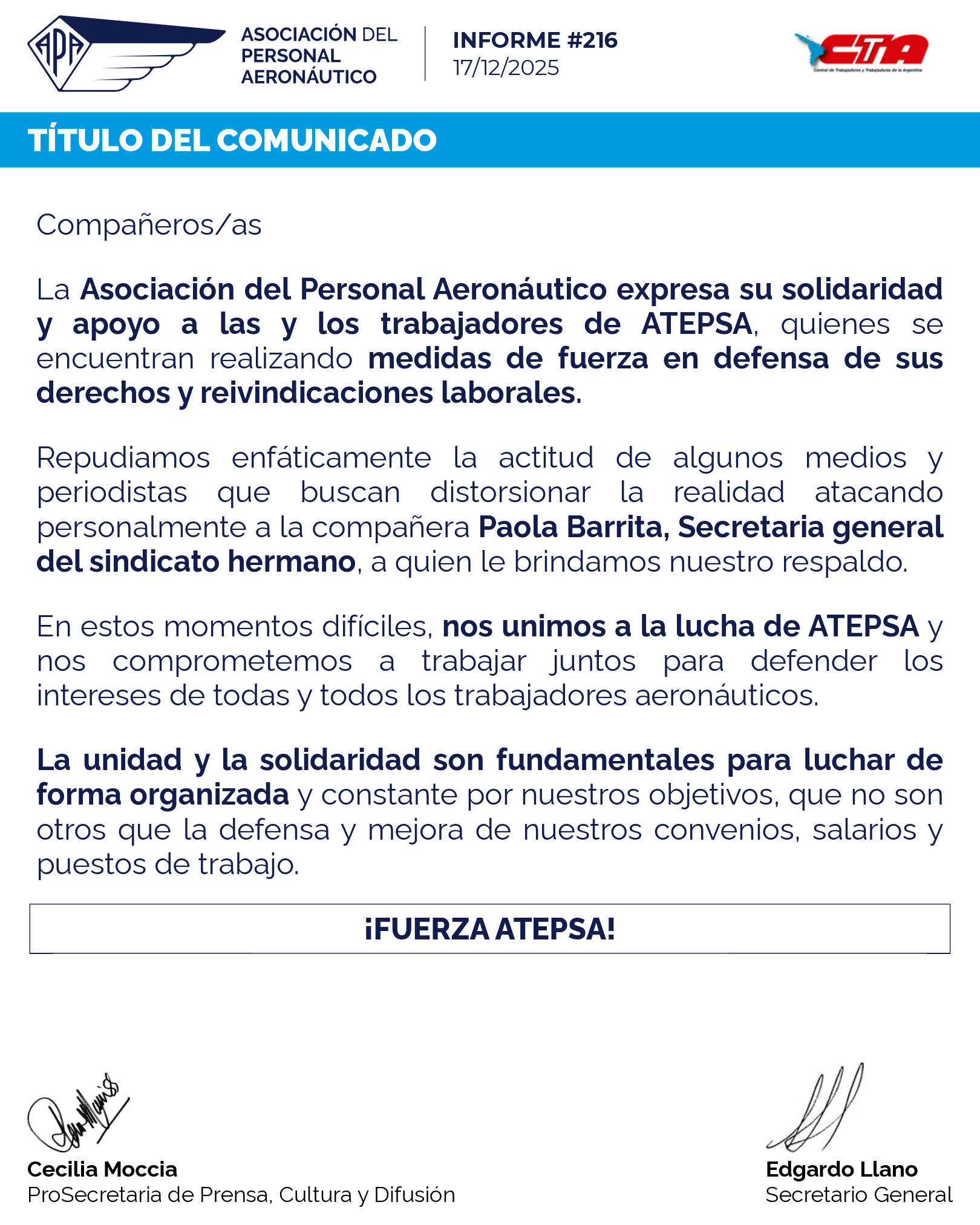 La Asociación del Personal Aeronáutico expresa su solidaridad y apoyo a las y los trabajadores de ATEPSA, quienes se encuentran realizando medidas de fuerza en defensa de sus derechos y reivindicaciones laborales.