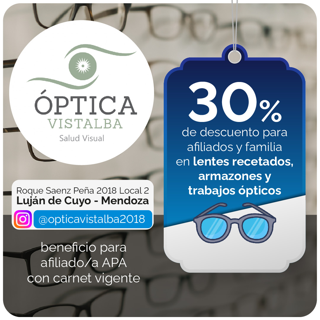 A partir de este convenio, todas y todos los afiliados, junto a su grupo familiar directo, podrán acceder a un 30% de descuento en lentes recetados, armazones y trabajos ópticos, presentando el carnet vigente de APA. El servicio incluye asesoramiento sin cargo y atención sin necesidad de solicitar turno previo.